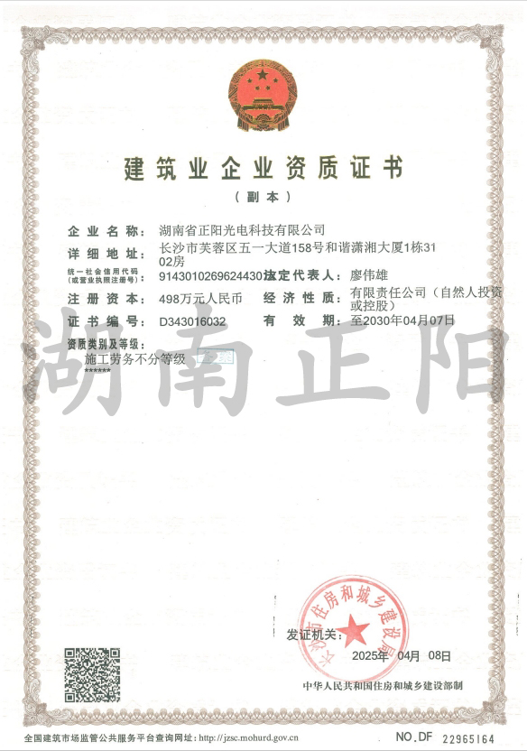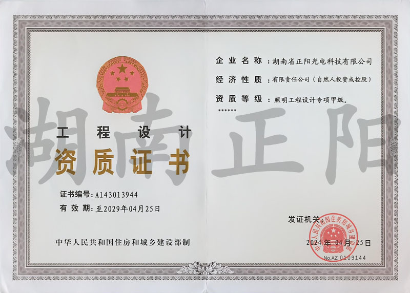 湖南省正陽光電科技有限公司是一家從事亮化工程及大型燈光藝術(shù)的設(shè)計、制作、安裝和維護于一體的專業(yè)化公司。公司資質(zhì)齊全、管理嚴(yán)謹(jǐn)、技術(shù)先進、實力雄厚,取得了城市及道路照明工程專業(yè)承包壹級資質(zhì)、照明工程設(shè)計專項甲級資質(zhì)、機電工程施工總承包貳級資質(zhì)、施工勞務(wù)等資質(zhì),榮獲“重質(zhì)量·守誠信”示范企業(yè)。